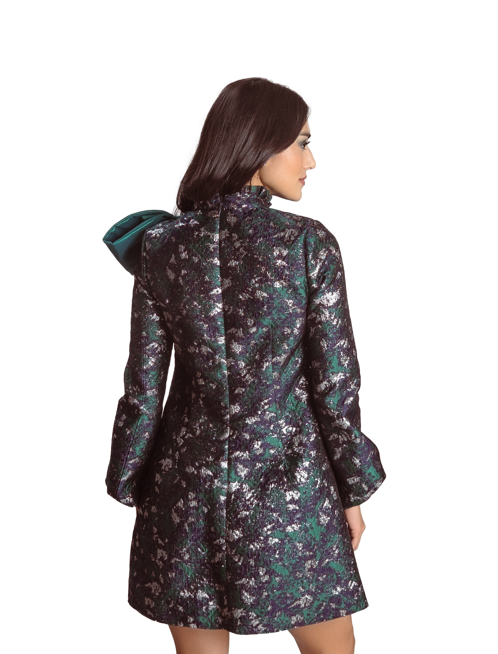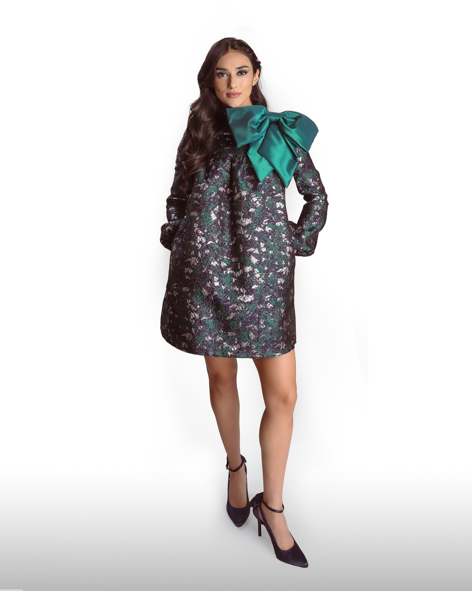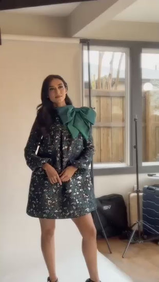 Polished yet playful, it’s the kind of piece you’ll reach for when the occasion calls for something special - cocktail parties, winter weddings, holiday parties, or an elevated girl’s night out. This is the party dress! Fun and flirty trapeze style silhouette with a rich metallic jacquard fabric and an unexpected statement taffeta bow. Looking for something a little more understated? The bow is removable!